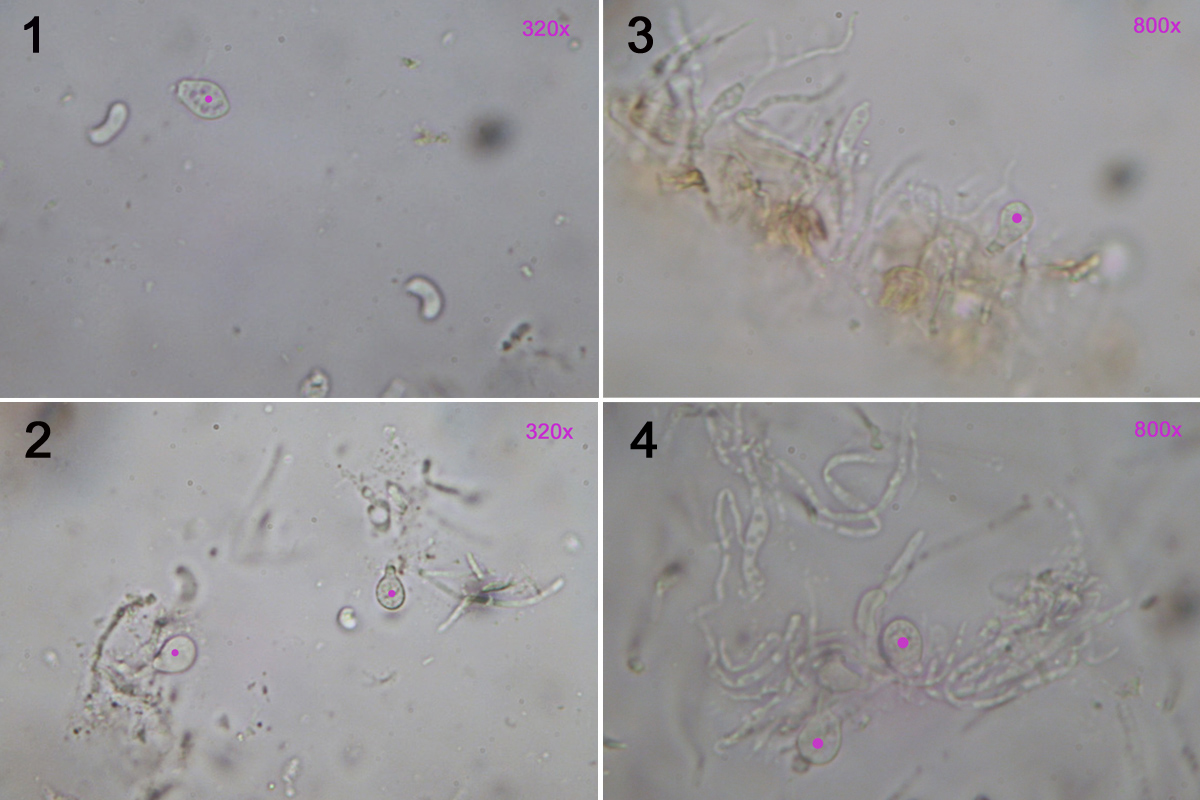 | Hallo Lothar & Andreas, habt vielen Dank für Eure Bestätigungen für den Knorpeligen Drüsling! Bei den Kondien möchte ich noch mal nachhaken. Die Dinger, die ich meine, sind bestimmt keine Basidien, siehe hier bei den Markierungen: Das Teil in Bild 1 halte ich für einen Konidiospore. Leider habe ich nicht mehr von diesen Dingern fotografiert, aber es schwammen zahlenmäßig ungefähr genausoviele davon rum wie Würstchen-Sporen. Als nächstes bin ich auf die Suche gegangen, wo sie wohl herkommen bzw. ob sie von der Exidia stammen. Die runden Zellen auf den restlichen Bildern habe ich diesbzgl. verdächtigt, vor allem auf Bild 2 das rechte Ding sieht schon ziemlich freischwebend aus. Dagegen spricht die Form der "Spitze" – auf Bild 1 leicht zugespitzt, auf den anderen Bildern rund. Also ist das Teil auf Bild 1 event. doch was Fremdes? Und wie nennt man die rundlichen, septierten Zellen der anderen Bilder? Schade, dass wir hier keinen Mikroskopier-Stammtisch haben, wo einem die alten Hasen bei der Interpretation helfen können... Viele Grüße – Rika