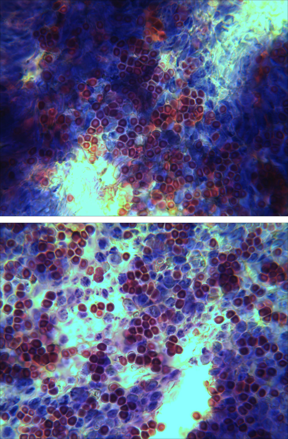 Wer nicht so recht weiß, wie Metachromasie im Mikroskop aussieht, hier ein extrem deutliches Beispiel, anhand von Coniolepiota aff. spongodes, einem Schirmlingsverwandten (gefunden in Äthiopien). Metachromasie bedeutet, dass nicht nur die farbe des Farbstoffs selbser auftritt, sondern noch eine weitere. Bei Pilzen ist das neben dem Blau vom Kresylblau noch Rosa. Macrolepiota-Sporen zeigen dann eine rosa farbene Linie in der Spore, weil die innere Sporenwand rosa reagiert. Bei Leucoagaricus reagiert auch der Porus rosa. Hier bei dieser neu zu beschreibenden Coniolepiota wird die ganze Spore rosa, während das restliche Gewebe halt blau ist, wie Kresylblau eben nun mal färbt. beste Grüße,