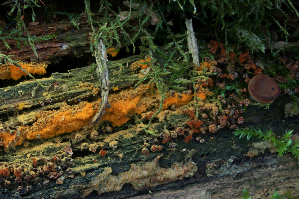 Hallo Herman, hier ein Foto mit auch einem jungen Becher (neben den Sporocarpien der Schleimpilze). Rate mal, was das wird. In Reife kann das Ding einen Ø von 10 cm haben. Viele Grüße – Rika