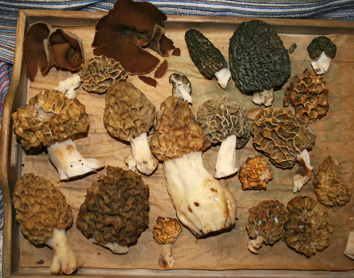 Als Größenvergleich: das Riesending in der Mitte misst von Kopf bis Fuß 17 cm! Noch liegen sie wie auf dem Foto – ich möchte sie jetzt bald putzen. Vermutlich gibt es für die verschiedenen/strittigen Bezeichnungen der Morchella-Arten eh keine mikroskopischen Unterschiede – oder wie seht Ihr das? Viele Grüße – Rika