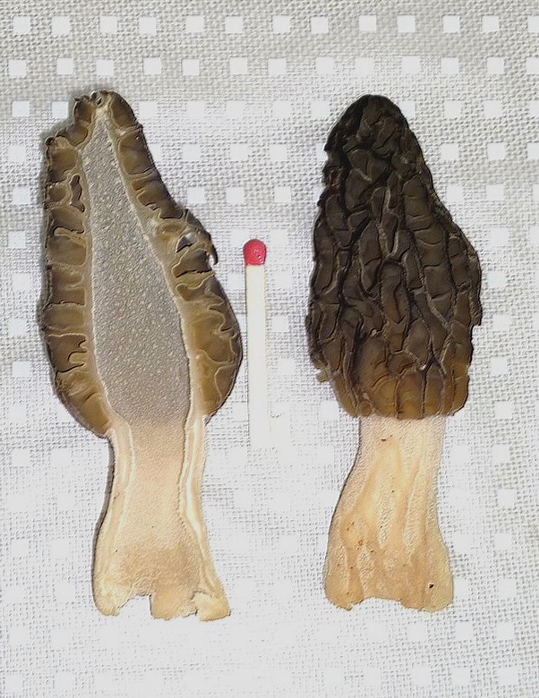 M.E. Hier treffe ich die sehr zerstreut wachsenden Spitzmorcheln mit mehrheitlich nach oben strebenden Rippen und der Stil ist aussen wie auch der Hutinnenraum gerieselt rauh. Ausserdem zeigen diese Spitzmorcheln ein grösseres Verhältnis Körperhöhe zu -breite. Ich ergänze anschliessend mit einem zweiten Bild-