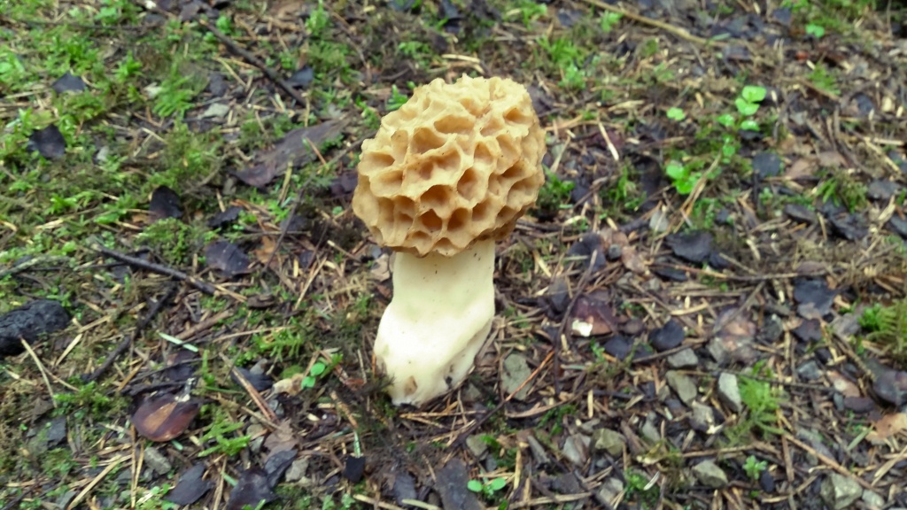 Im Nordschwarzwald, roter Sandstein, (Fichten/Tannen) unterwegs im Flocki-Wald. Auf dem mit Kalkschotter belegten Waldweg standen plötzlich 2 große frische Speise-Morcheln vor mir. Hatte ich doch die Morchel-Saison schon lange abgehakt,