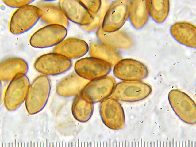 Servus Günther, habe nochmal nachmikroskopiert. Die Sporengröße lag in KOH 3% bei (8,5) 9-10,5 (11,5) x (5) 5,5 (-6,5) µm, wobei die "normalen" Sporen im Bereich von 9-10,5 x 5,5 µm lagen (die Breite recht konstant!), die "übergroßen", rel. selten, bis 11,5 (12) x 6,5 µm. Ich hänge mal ein Foto des Umrisses an und danach ein Foto der Oberfläche. Gruß Helmut