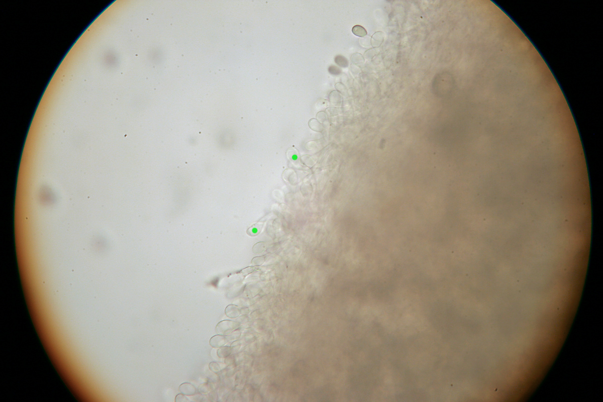 Die meisten Basidien sind 2-sporig, etliche 3-sporig. 4-sporige habe ich nicht gefunden. Könnte mir noch jemand erklären wie ein Ixotrichoderm aussieht im Gegensatz zu einer Ixokutis, bzw. wie man die HDS-Form nennt, die ich im Eingangsbeitrag von diesem Saftling zeige? Hier noch ein Bild der Lamellenschneide – sind diese "Keulen" Cheilos oder junge Basidien? Spitzen habe ich nicht dran gefunden. Danke & viele Grüße – Rika