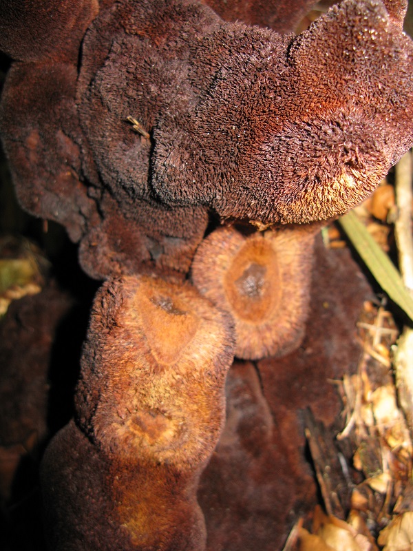 dieses bräunliche Dingsda habe ich neulich neben einem morschen Baumstubben entdeckt. Der Kern besteht ebenfalls aus morschem Holz.