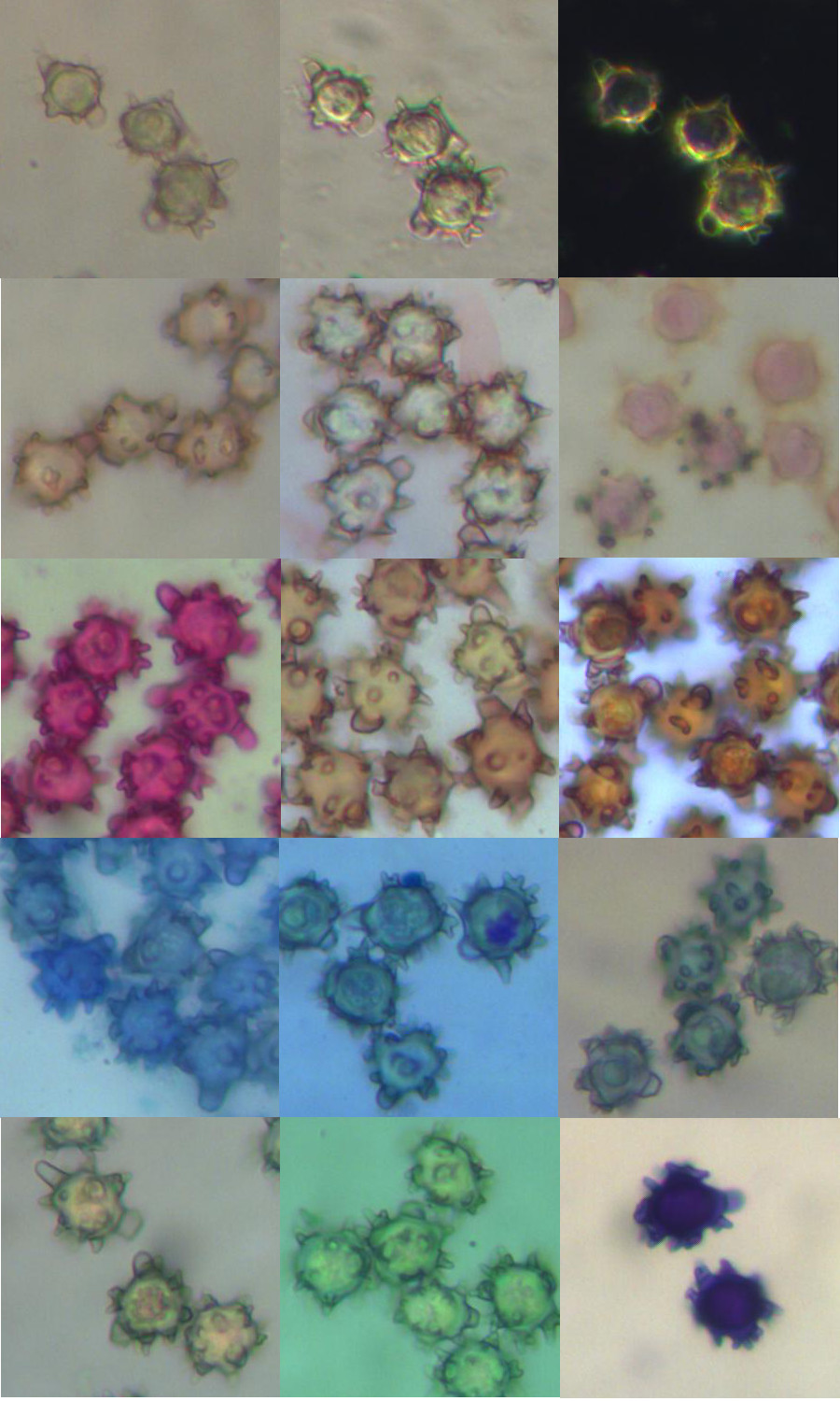 meinen ersten Stäubenden Zwitterling (den ich damals noch nicht kannte)hatte ich damals nach Hornberg zur Pilzausstellung gebracht. Walter Pätzold hat ihn dort mit was eingefärbt und unter das am Monitor angeschlossene Mikroskop gelegt. Was er da genommen hatte, weiß ich nicht, was rötliches. Nun finde ich die Art nicht sehr oft. Und kürzlich, beim jüngsten Fund war da kein braunes Pulver drauf - als muss es ja der Beschleierte sein. Logisch oder! Aber der Beschleierte war ich. In der Plastikdose hat er sich während ich zur DGfM-Tagung war gut weiterentwickelt. Nun fragte ich mich, wie man die Sporen am besten zur Geltung bringen kann. Nachdem die Lumix nicht so wollte wie ich, habe ich meine Tucson 1,3MP Camera angeschlossen und meinen Farbenkasten aufgemacht. Gemeinsam mit Farbfehlern der Kamera und mehr oder minder automatischem Weißabgleich sind die Ergebnisse nicht so toll geworden. So mache ich ein erschwertes Rätsel daraus. Wer errät, mit was ich welches Bild gemacht habe. Zu zählen von links nach rechts und von oben nach unten. Tipp: bei zwei Bildern habe ich den gleichen Farbstoff,aber mal mit und mal ohne Weißabgleich der Software. Das Ganze hat sich für mich als gar nicht so einfach dargestellt, beim Herausspülen der Farbe sind die Sporen mit entfleucht und die Farbe mal angetrockent usw. Mit dem Auge sieht es jeweils deutlich besser aus. Viel Spaß damit.