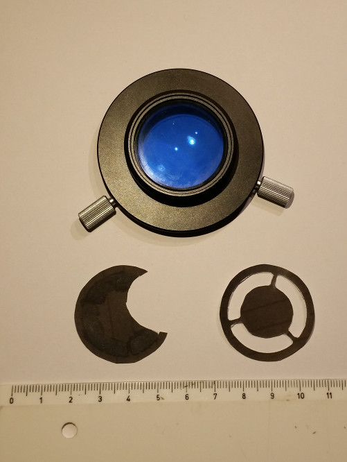 Hallo Claus, ja, aus Papier ausgeschnitten und auf die zentrierbare Zusatzlinse unter dem Kondensor gelegt . Mit Größe des Ausschnitts und Blendeneinstellungen muss man dann etwas probieren. Im Netz findest du sicher bessere Informationen zu dem Thema. Die Dunkelfeldblende rechts habe ich von einem Originalteil abgemalt und hätte es als Datei zum Ausdrucken, falls das jemand will. Gruß Alis