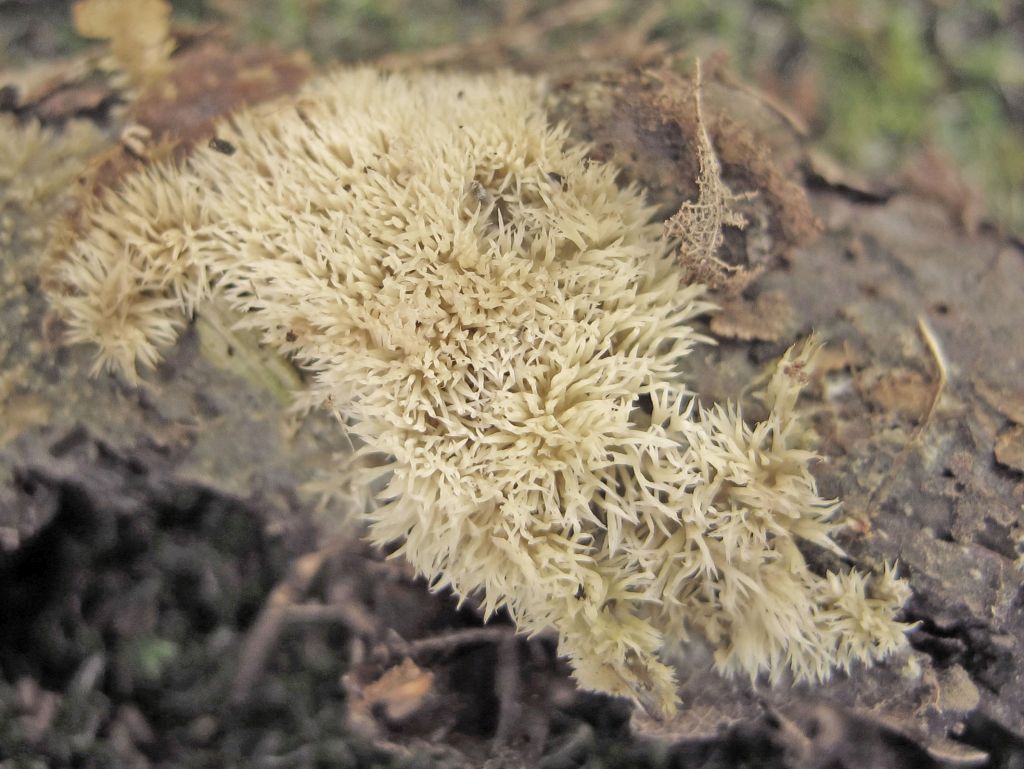 30 x 13 mm breit, 6 mm hoch, borstig verzweigt, creme, keine Reaktion auf FeSO4, Astspitzchen gebräunt (angetrocknet?), die Spitzen sind meist einfach, aber auch mehrfach geteilt (bis 4), In Aufsicht feinst bereift bis kurz borstig, die Äste haben unter dem Mikro eine dunkle Mittellinie, die zum Rand mit meist zylindrischen, langen, parallelverlaufenden Hyphen (mit schwer zu findenden Schnallen) umkleidet ist. Hieraus stehen senkrecht verschiedene Elemente ab, u.a. zylindrische, apikal verschmälerte, gerundete, teils etwas wellige Zystiden(?), bis 4 µ dick. Das ist das, was die Oberfläche in Aufsicht leicht borstig erscheinen lässt. Die apikal gespitzten Äste haben alle in der Mitte eine dunkle Linie. In der größten Vergrößerung wirkt die Linie wie ein rundum wirr stacheliger Schlauch.