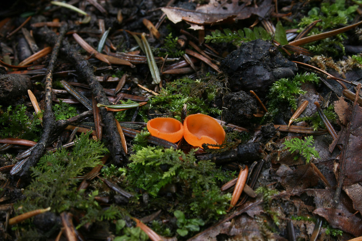 Hallo miteinander! Gestern liefen mir so an die 50 dieser kleinen Becherchen auf 1/2 qm über den Waldweg, genau genommen wuchsen sie auf der von Forstmaschinen umgewühlten Erde neben einer geschotterten Forststraße. Größenvergleich siehe Tannennadeln. Die reifen Fruchtkörper sind flach und haben einen Ø von knapp über 1 cm. Diese Dinger haben mich ganz schön verarscht ... erst 5 m weiter, an einem weiteren Standort offenbarten sie sich – aber das kommt später. Viel Spaß beim Raten & viele Grüße – Rika