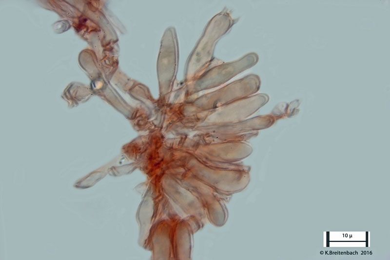 Basidien und Zystiden: Basidien mit 4 Sterigmen. Es wurden keine Zystiden gefunden die von der Form der Basidiolen abweichen.