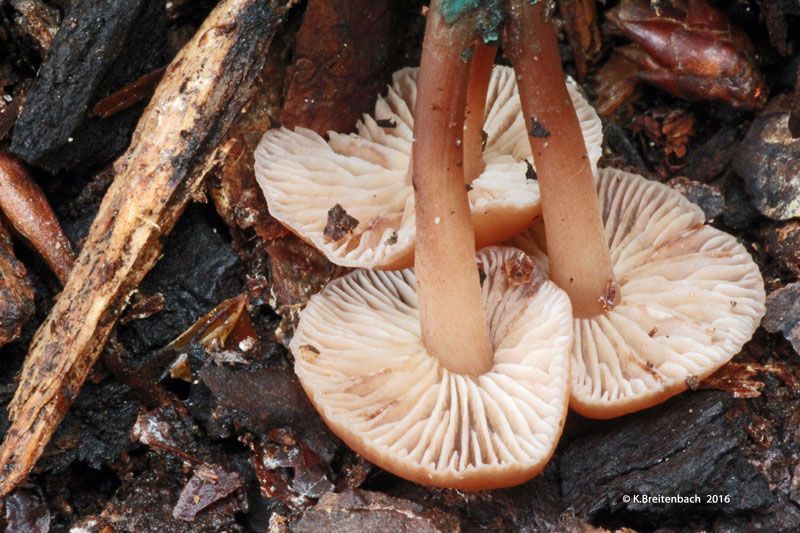 Lamellen: Schmutzig, beigebraun, leicht angewachsen. Nicht dichtstehend. Abwechselnd eine lange Lamelle bis zum Stiel und eine kurze Lamelle, die nur wenige mm lang ist. Einige Lamellen sind gegabelt.
