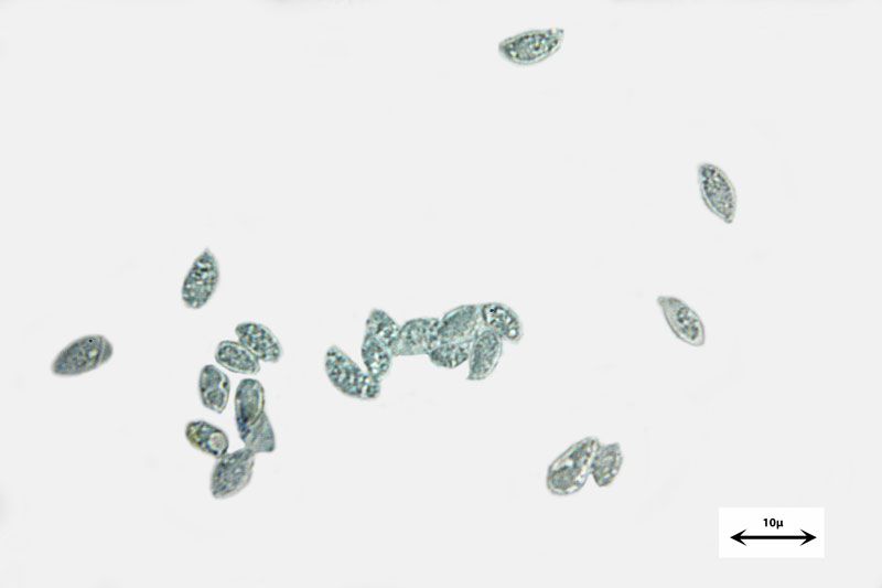 Sporen: Das Sporenpulver ist weiß, die Sporen sind hyalin und nur schwierig zu erkennen. Die gefundenen Sporen haben die Abmessungen Mittelwert: Länge: 6,37; Breite: 3,6; Q: 1,77. Die Form ist elliptisch, bis tropfenförmig. In den Sporen sind ein oder auch mehrere Tropfen zu sehen. Oberfläche erscheint glatt.