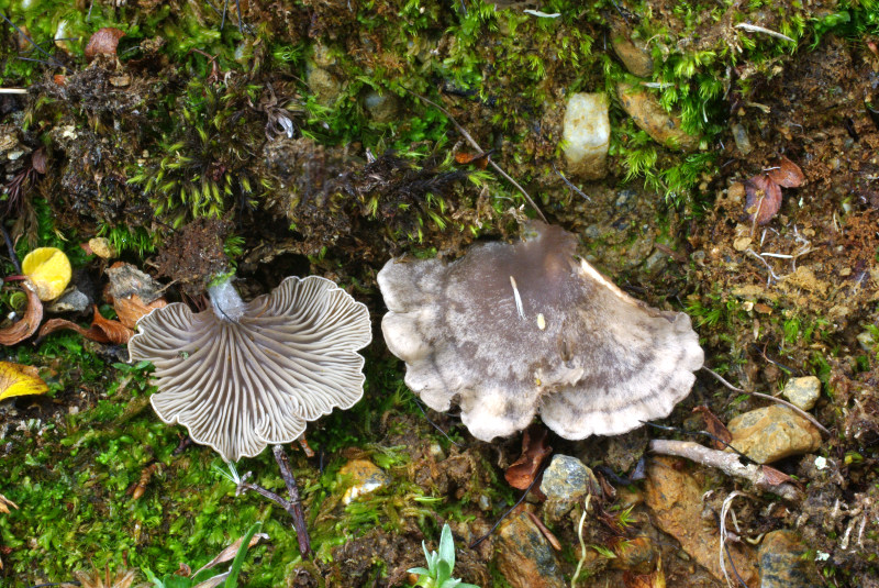 Servus, noch ein "Seitling", mit deutschem Namen u. a. Grauer Zwergseitling genannt (Arrhenia oder Omphalina acerosa). Sporen und 4-sporige Basidien passen, der Geruch war undeutlich. Mitte September begegnete er mir auf ca. 2200 Meter Höhe im österreichischen Stubaital mehrfach an feuchteren bis fast nassen Stellen. Die Böden dort sind sauer. Gruß Helmut