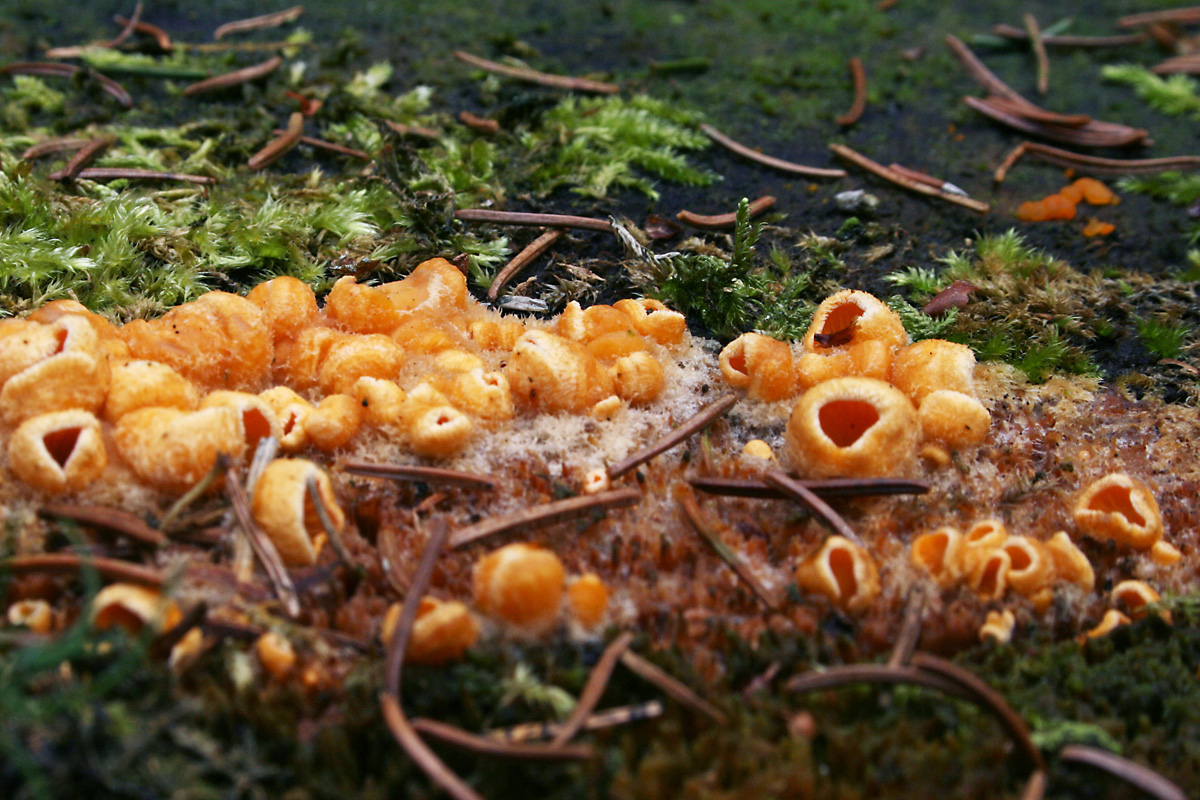 Hallo miteinander! Heute hatte ich mal wieder Ausgang UmUlmHerum... dabei lief ich diesen netten Pilzen übern Weg. Sie tummelten sich auf und in einem morschen Fichtenstumpf, auf dem Grund lag noch Schnee. Wer kennt sie? Viele Grüße – Rika