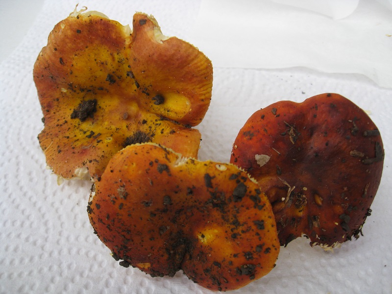 Hallo in die Runde, Tja, sie sind nicht einfach. Wie schon gesagt habe ich da echt Schwierigkeiten. Weil dieser Pilz am Standort so schön leuchtete und auffällig war, dachte ich in meiner Mittagspause, eine makroskopische Bestimmung sollte relativ einfach sein, aber je mehr ich in meinen Bestimmungsbüchern nach Photos blätterte, desto unsicherer und verwirrter wurde ich. Können mir hier die Experten weiter helfen? Standort im Hainbuchen-Hain, parkähnlich nicht auf Rasen, Begleitpilze andere Täublinge, in der Nähe Perlpilze. Gesellig in einer Linie (Kreis?) um ein Gedenkstein wachsend. Leuchtend orange mit kräftigen Rot-Tönen (die abgebildeten Exemplare sind etwa 6 Std nach Entnahme aufgenommen worden, und nicht mehr so intensiv gefärbt, da durch die aufziehenden Regenwolken die Lichtverhältnisse auch nicht dazu beigetragen haben, dass die Farbenpracht richtig rauskommt). Lamellen brüchig, gelb. Huthaut etwa zur Hälfte abziehbar, darunter gelb. Stiel im Alter puffig. Geruch und Geschmack unbedeutend und angenehm, nicht scharf. Könnte dies der Gold-Täubling sein? Vielen Dank im voraus Thomas