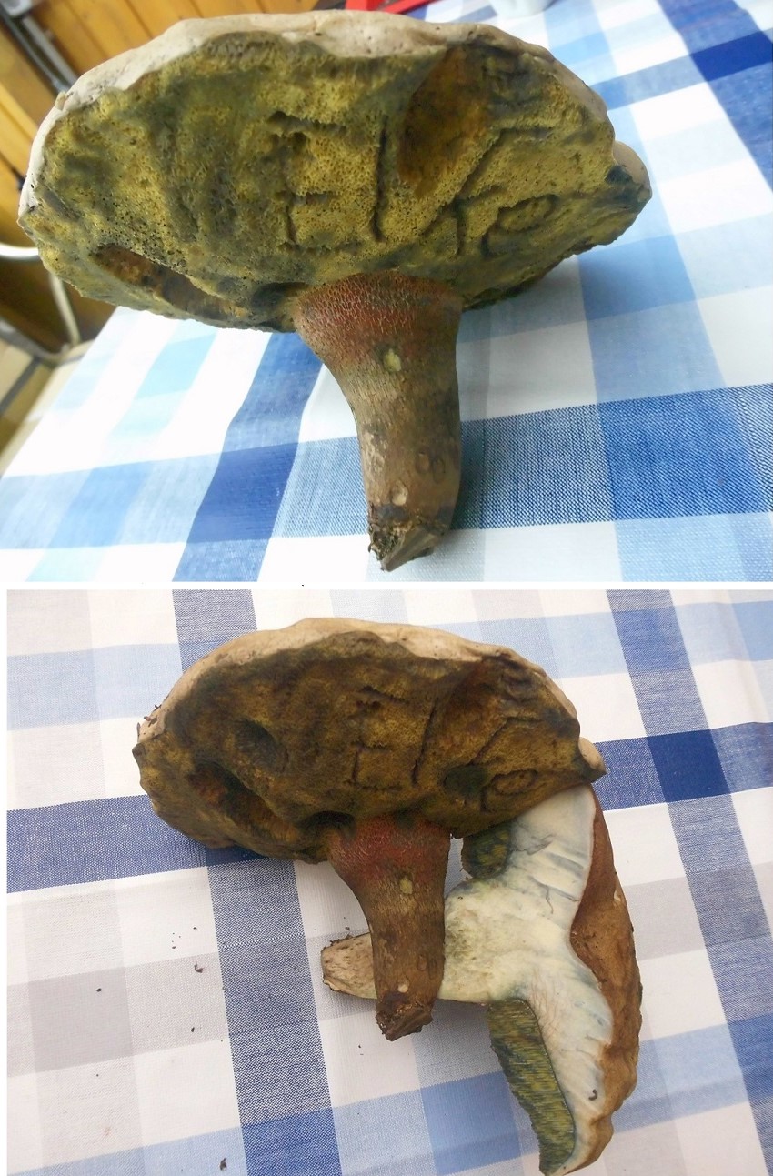 Der Röhrling ist 13cm hoch und hat einen Durchmesser von 20cm. Geruch ist angenehm und der Geschmack sehr leicht bitter. Der Pilz stand heute einzeln im Fichtenwald im Harz.