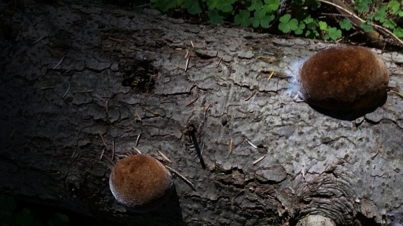 Hallo, An einem liegenden Weißtannen-Stamm fand ich heute seltsame Gebilde. Aus der Ferne war ich überzeugt es sind Pilze, ovalrund, braun-samtige Oberfläche wie Flocki.