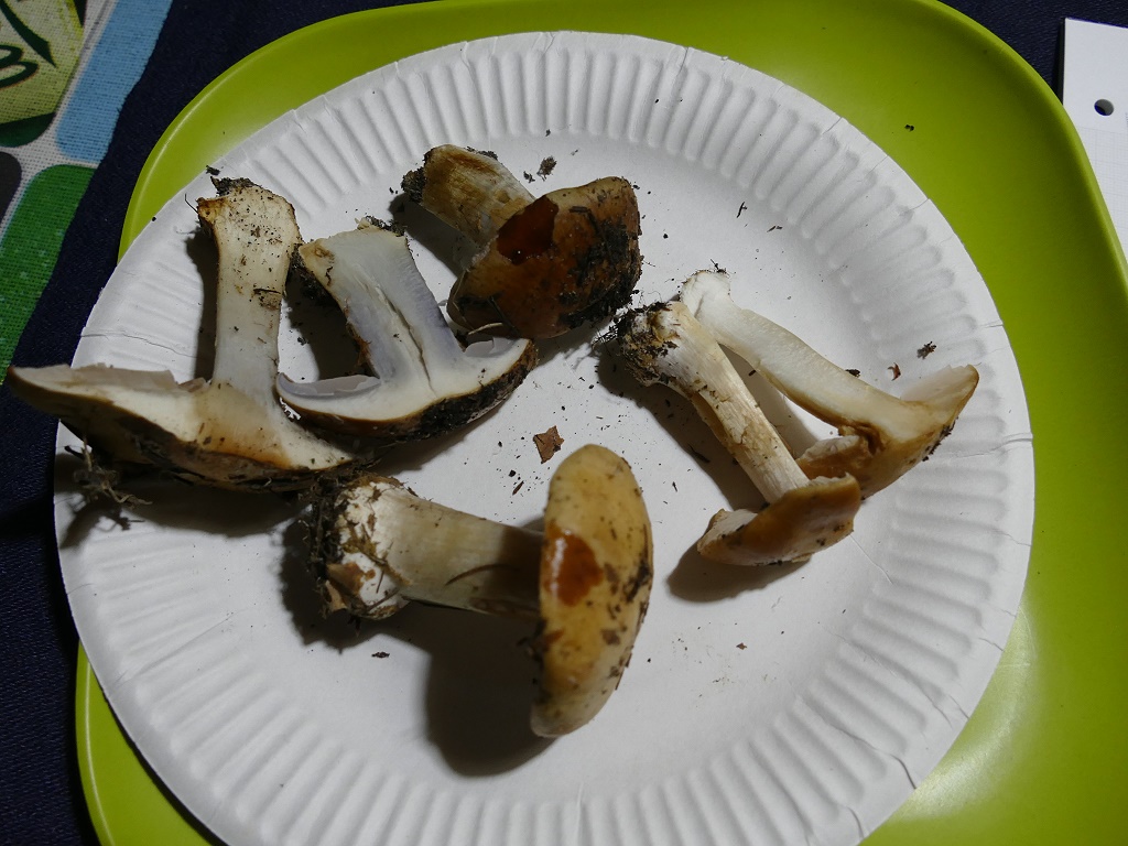 Die drei oberen Teile sollten ziemlich eindeutig C. glaucopus sein. Entlarvend erscheint mir die Blaufärbung im Stiel. Bei den unteren Teilen bin ich etwas ratlos. Die Flusen am Stiel waren irgendwie gelblich, was den berühmten Schleierritterling ausschließen sollte. Ich habe die Pilze auch noch mit Kalilauge bekleckst, was vielleicht hilfreich sein könnte. Beide Arten rochen angenehm bis gar nicht. Nach der Geschmacksprobe hätte ich sie am liebsten in der Pfanne geschmort. Nein - Spaß beiseite! Was meint ihr dazu?