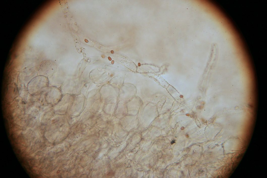 Hallo Andreas, ich war ja schon drauf & dran, Dir eine Mail zu schreiben, dann hat mich doch der Ehrgeiz gepackt... Bei der Pleurofrage war ich mir nicht sicher, ab wann man von Fläche vs. Schneide spricht. Bei dem einen Auflichtbild sieht man eine Zystide, die seitlich raus wächst, aber schon sehr dicht an der "Ecke". Schnallen sah ich nur an den zyl. Zellen des Behangs/Velums am Hutrand, und die waren winzig. Allerdings habe ich mir den Stiel nicht angeschaut, wahrscheinlich wären dort Schnallen leichter zu finden gewesen – falls dort vorhanden? Und dann habe ich nur in Wasser mikroskopiert, nicht in KOH (obwohl ich Deine Empfehlung vorher gelesen hatte), das war schon ein Im-Trüben-Fischen ;-) Maße: Ich habe 9 braune Sporen vermessen 6,5…6,9…7,3 x 3,7…3,8…4,1(4,5); Q (1,66)1,75…1,82…1,97