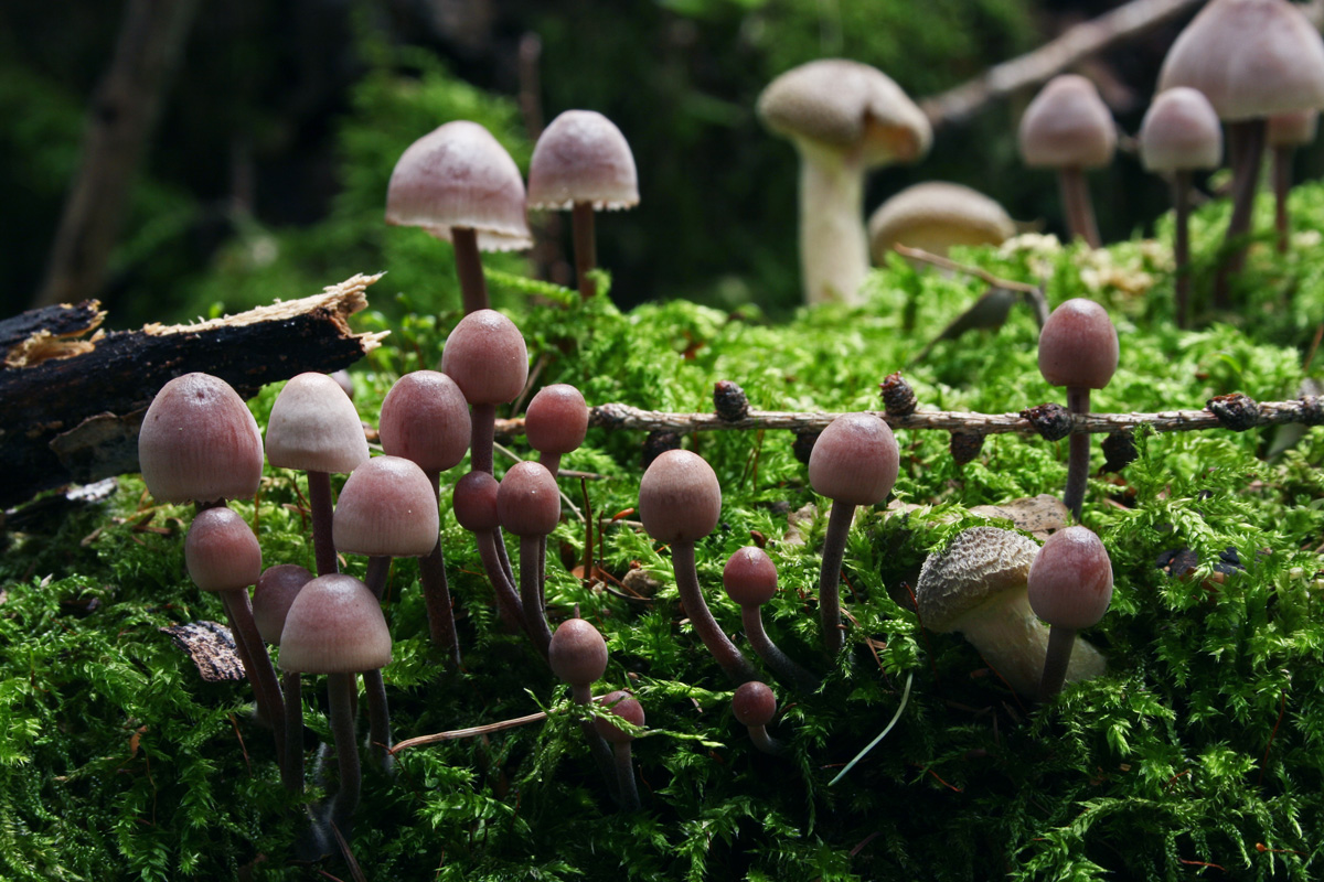 Lieber Coco, vrmutlich habe wir hier nur ein Zuordnungsproblem. Auf dem Doppelbild sind links die braunen, jungen Hallimasch zu sehen – vermutlich auf Fichte, jedenfalls Nadelholz. Auf dem rechten Bild (vom 21.9.18) sind die grauen Köpfchen – das Substrat ist hier wirklich Buche, notfalls noch Hainbuche. Die Hallimasch waren in Gesellschaft von Mycena haemotopus, siehe Foto. Meine Frage ging ursprünglich darum, ob man aufgrund der Hutfarbe junger Fkr. (gelbbraun vs. grau) schon was zur Art sagen kann. Diese Farbbeobachtungen trafen nicht nur für einen einzelnen Standort zu, sondern für mehrere Wälder. Es kann ja gut sein, dass eine Arm.-Art früher fruktifiziert als eine andere – dann passt meine Beobachtung. Kann aber auch sein, dass die gleiche Art unterschiedliche Hutfarben haben kann, vielleicht substrat- + feuchtigkeitsabhängig? Gute Nacht – Rika