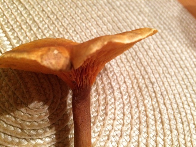 Beschreibung: Hut ca. 6 cm breit, Stiel ca. 5 cm lang, Hut orangebraun, flach trichterig, Lamellen orange, herablaufend. Stiel hohl und faserig.