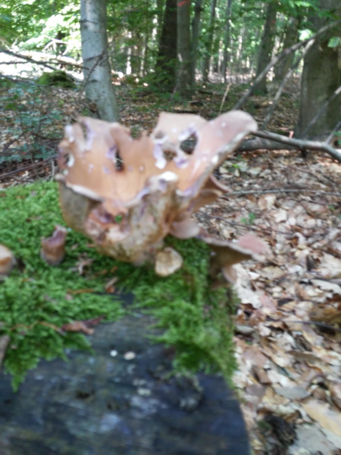 Vorab schon mal Entschuldigung Habe lange überlegt ob ich so ein Photo hier überhaubt reinstellen darf/soll, aber ich brauch einfach mal Hilfe. Als ich den Pilz fand war ich mir sicher ihn einfach bestimmen zu können, da er sehr charakteristische Merkmale hat. Leider habe ich nichts beim Blättern in meinen Büchern gefunden. Die Bildqualität ist natürlich unter aller Sau, aber vieleicht kann mir doch jemand einen Tipp geben. Standort Baumstumpf, Huthaut hell braun, herunter laufende Lamellen weiß, Stiel sehr zäh, Geruch angenehm pilzig, alte Frasstellen lila/rosa. Da müßte doch was gehen. Danke im voraus Thomas