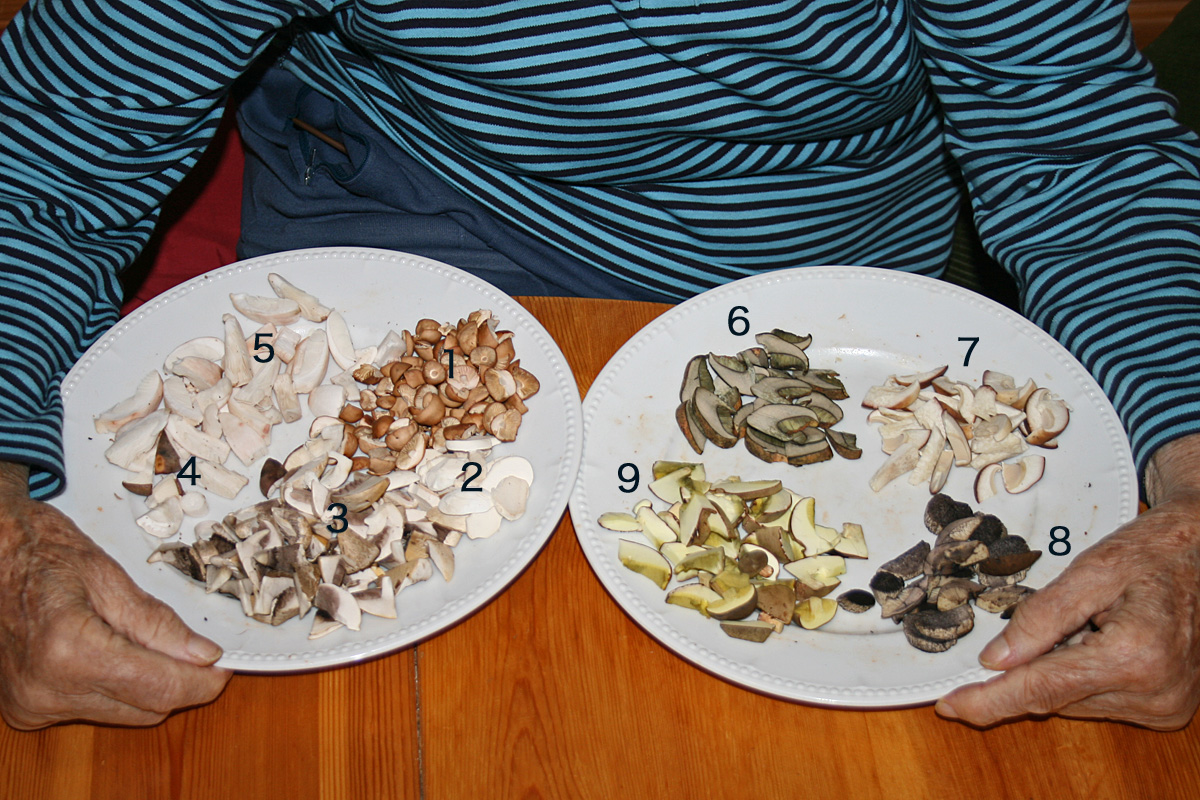 Hallo miteinander! Hier UmUlmHerum ist es immer noch ziemlich trocken. Die kleinen gelegentlichen Schauer erfreuen zwar die Wiesenpilze, aber im Wald geht nur wenig voran ... für ein feines Sößle hat´s trotzdem gereicht. Wer findet raus, was da geputzt auf den Tellern liegt? Gute Nacht – Rika P.S.: Demnächst kommt was Anspruchsvolleres von mir, ich muss aber erst die Bilder aufbereiten – ein riesen Täubling in rot einschl. Stiel, mild(!), fest, genetzte Sporen, SPP weiß – keine Peilung!