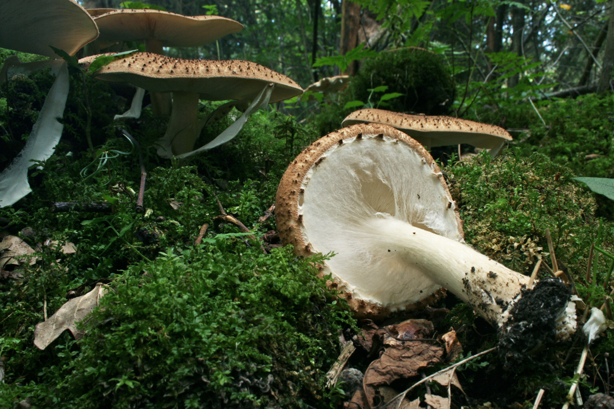 ––––––––––––––––––––––––––––––––––––––––––––––––––––––––––––––––––– Hallo Thomas, das hast Du alles perfekt beobachtet – Kompliment! Das Häutchen nennt man Velum. Bei Echinoderma aspera fällt er ab, sobald sich der Hut ausbreitet, wie im Foto bei den Fruchtkörper im linken Hintergrund. Wenn der Pilz älter ist, sieht man vom Schleier gar nix mehr – das kann auch irritieren. Weiterhin viel Spaß beim Neue-Pilze-Kennenlernen! Gute Nacht – Rika
