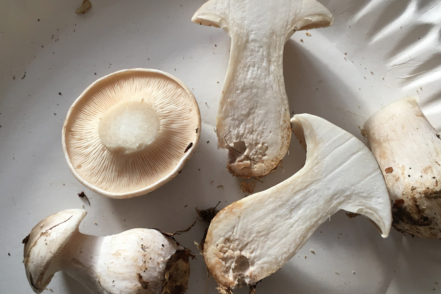 Stiel angewachsen, Lamellen herunterlaufend mit Lamelletten, ganz leicht cremfarbend