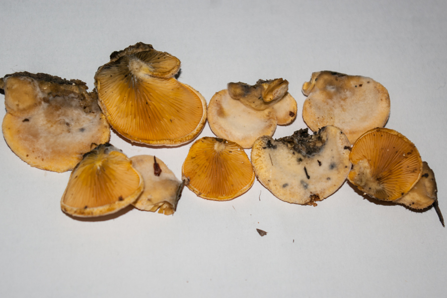 Auch mit diesen Pilzen komme ich nicht weiter. Am Fundort erschienen sie mir leuchtend gelborange. Jetzt sind sie etwas verblasst. Am liegenden Stamm, eher reihig nebeneinander als dachziegelartig.