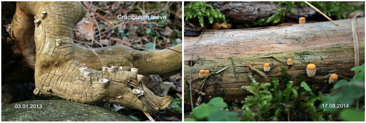 Die beiden kann man doch eigentlich nicht verwechseln!? Der eine ist düster in Grautönen, auch die Peridiolen, während der andere beige-gelbliche und orangenen Farben hat mit gelblichen Peridiolen. Und dann noch dieser umgestülpte Rand beim Topfteuerling. Bei den deutschen Namen kann ich mir schon eher Verwechslungen vorstellen: Topf und Tiegel – das hilft bei der Form nicht wirklich weiter... normalerweise wäre ein Tiegel ja flacher und breiter als ein Topf. Hier noch ein Foto meiner ersten beiden Tiegelteuerlinge.
