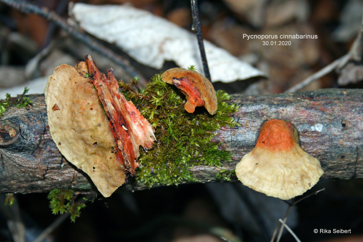 Hallo Doris, dank´ Dir für Dein positives feedback – tut gut. Heute war ich noch mal bei den tollen Rindenbechern, und da sind die Zinnober-Trameten gleich neben an. Deine Bemerkung "dickfleischig" hatte mich doch ins Grübeln gebracht, ob ich da vllt. nicht genau genug hingeschaut hätte. Jetzt kann ich alles erklären: der Frk. saß ganz oben auf dem Ast, deswegen hat er diesen atypischen mittleren Knubbel gebildet (sonst hätte er keine gescheite Konsole hingebracht). Das Foto ist direkt von oben. Dann zupfte ich zwei weitere ausgeblichene Frk. aus und legte sie daneben, den einen von unten, den anderen von oben mit jeweils ein bisschen Substrat mit dran. Jetzt sind alle Zweifel beseitigt ;-) Viele Grüße – Rika