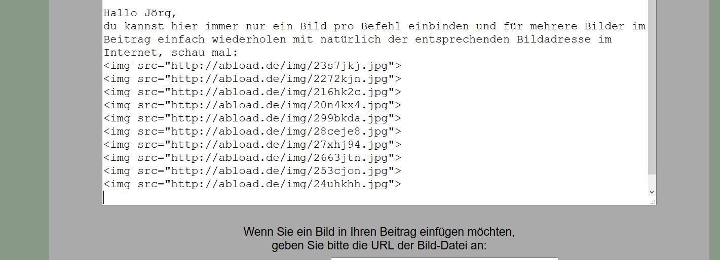 du kannst hier immer nur ein Bild pro Befehl einbinden und für mehrere Bilder im Beitrag einfach wiederholen mit natürlich der entsprechenden Bildadresse im Internet, schau mal: