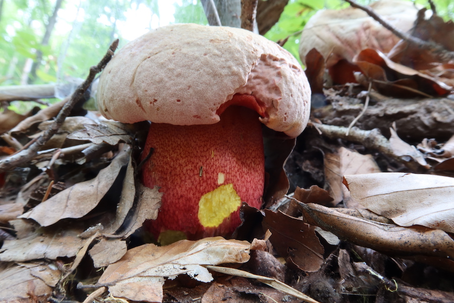 | Servus Bertl, mit dem so hellen Fleisch ist das klar ein Satanas. Der Rosahütige muss nicht immer rosa am Schädl oben sein (nur wenn er einen Sonnenbrand bekommt), aber er hat immer schön gelbes Fleisch. Siehe unten, der Schneck erspart das Messer. Gefunden übrigens im 14. am oberen, "staubfreien" Weg im Halterbachtal zur Rieglerhütte. Ich nenne das den Rhodoxanthus-Weg, fast immer wenn ich im Sommer oder Herbst dort unterwegs bin, finde ich diese Röhrlinge an mehreren Stellen neben dem Weg. Gruß in die Nachbarschaft, michel