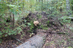 Guten Morgen, im Flachland geht es gelegentlich zu wie im Gebirge, man muss auch hier, will man einen ganz bestimmten Punkt erreichen, statt spazieren zu gehen ein wenig klettern. Jedenfalls dann, befindet sich dieser Punkt in einer Umgebung vom Sturm gestürzter Bäume. Ich wollte nichts mehr finden. Der, obwohl komfortabel breite, Gurt an meiner Tasche ließ mich langsam die Druckstelle auf meiner Schulter, verursacht von gut 5 kg Birkenporlingen, immer deutlicher spüren. Ich wollte nur noch auf dem schnellsten Weg nach Hause. War auch schon dran vorbei, da rief mir forsch der Pilzgeist zu: "Halt!" Ganz milde dann die Frage, er wusste, er hatte mich bereits: "Was war das?". Also ein paar Meter zurück, ein wenig klettern, mich dabei fragen, wie konnte ich, bei aller Last, dieses Riesenteil beinahe übersehen? Dank und Gruß