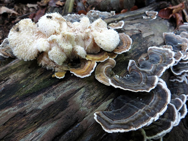 | Liebe Pilzfreunde, vor ca. einem Monat habe ich diese Vergesellschaftung von Stachelbart und Schmetterlingstramete (?) auf Rotbuche gefunden. Den Ästigen Stachelbart habe ich schon öfter in meinem Pilzrevier (Ö, Wiener Wald, Rotbuchen-Eichen-Mischwald) gesehen, aber der hier sieht für mich eher nach dem Dornigen St. aus. Oder ist es doch ein Ästiger in jungem Stadium? In Erwartung eurer geschätzten Meinung und mit lieben Grüßen aus Wien, Herbert