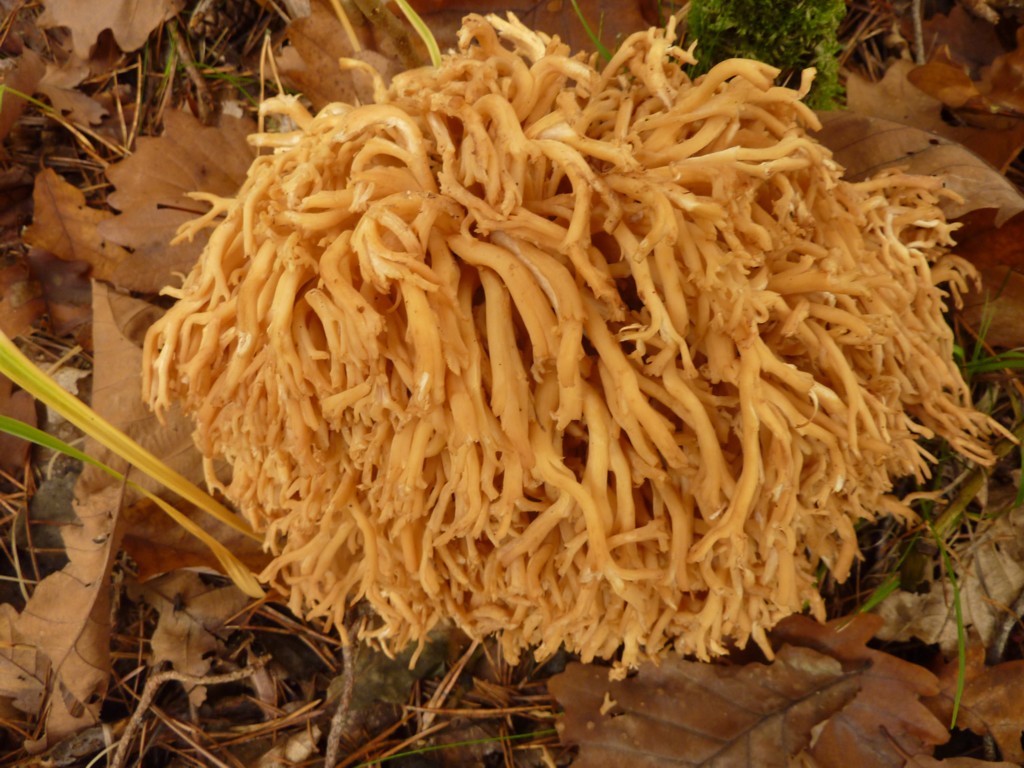 Ende Oktober war ich mit einem Journallismus Studenten unterwegs,um Pilze für ein Video zu finden.Dabei war auch eine Koralle,LIEGEND an einer Wegböschung,Mischwald mit vielen Kiefern auf Sand,sehr groß und schwer.Der Student hatte es eilig und nahm alle Funde mit.Als ich im letzten "Tintling"das Foto einer Feinstacheligen Koralle,Ramaria spinulosa,von Tobias Luschner,sah,fiel mir mein Foto wieder ein.Aber eine Bestimmung ist damit allein wohl nicht möglich.Suche in meiner älteren Literatur und Google war negativ.