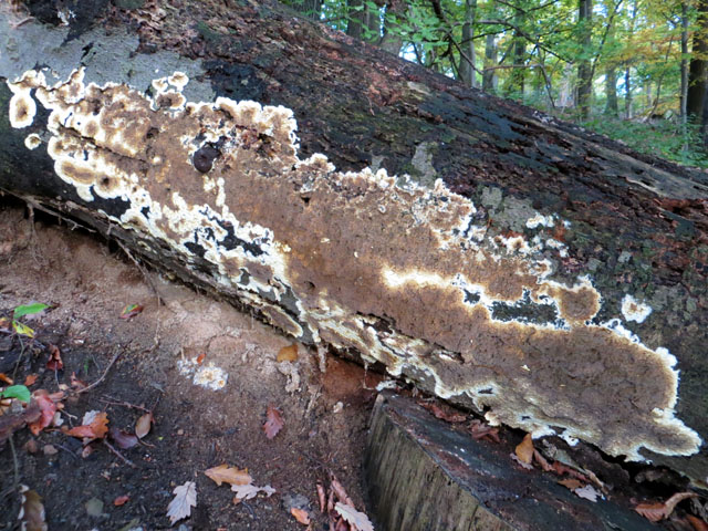 An einem liegenden, sehr morschen Stammfragment einer Rotbuche. War beinahe 1,5 m lang und 40 cm breit.