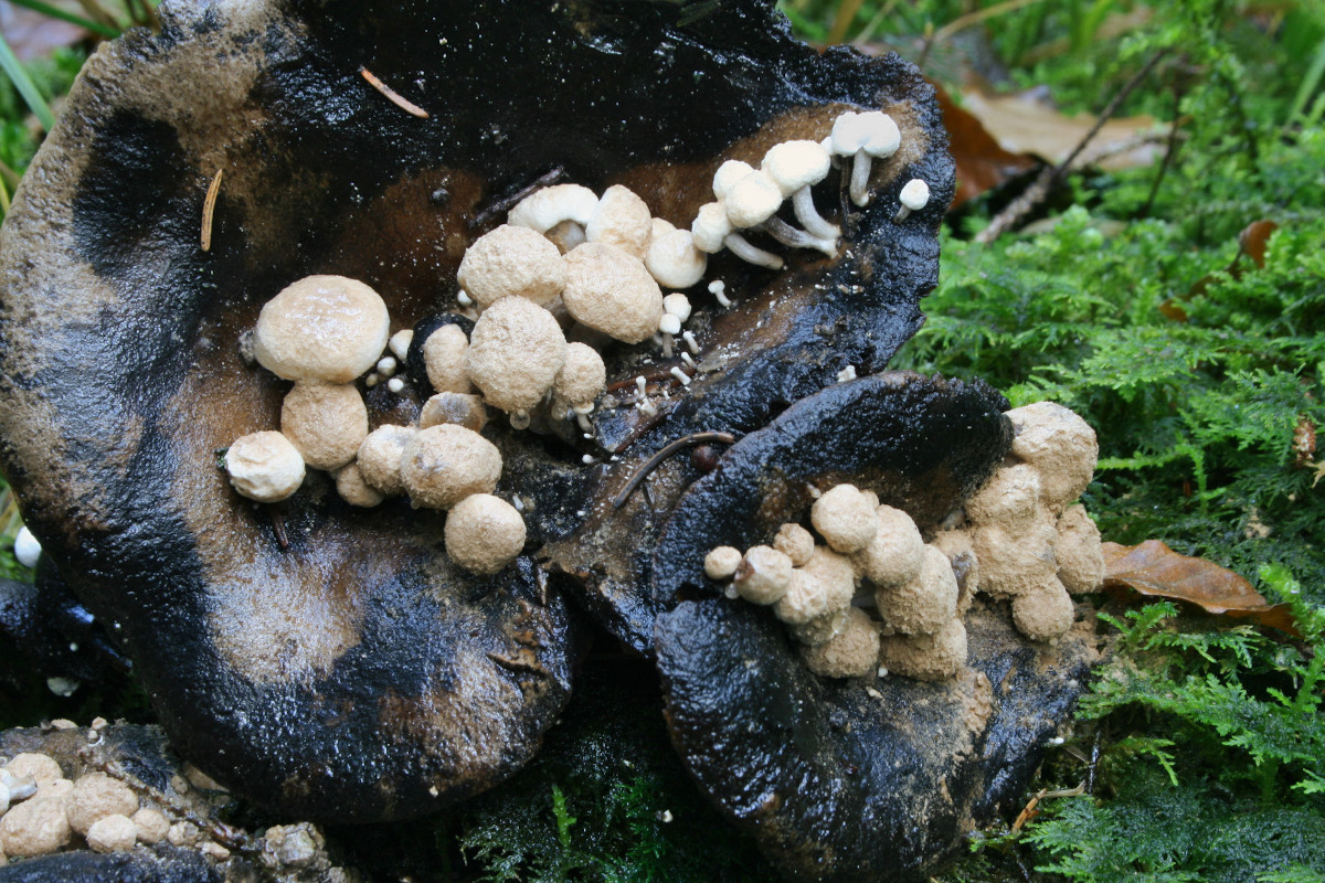An Speisepilzen mangelt es auch hier nicht, bspw. Herbsttrompeten, Stockschwämmchen, Trompeten-Pfifferlinge, Täublinge, Hallimasch... Vielleicht kommen ja noch Röhrlinge nach, aber z.B. die Maronen sind derzeit alle schon alt/überständig. Dafür finde ich diesen Herbst viele nicht so häufige Pilze wie den Laubholz-Glöckchennabeling (Xeromphalina fraxinophila), den Blütenförmigen Saftporling (Postia floriformis) oder den Stäubenden Zwitterling (Asterophora lycoperdoides) auf alten Schwärztäublingen. Viele Grüße – Rika