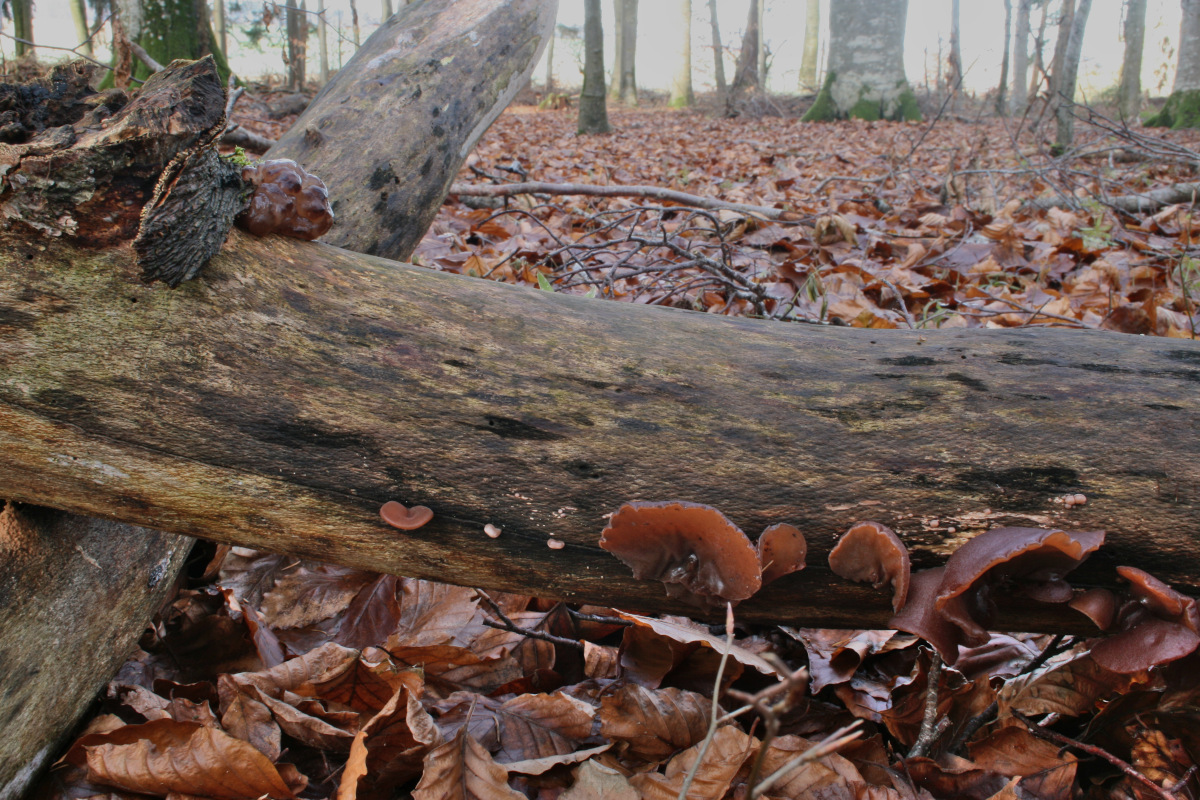 Hallo Rainer, in diesem "Winter" (und auch schon im Herbst) fand ich ausgesprochen viele Judasohren an dicken Buchenästen! Auf dem Foto seht Ihr links oben "noch mal was" – das ist Ascotremella faginea, der Schlauchzittering, wie der Name schon sagt: ein Ascomycet. Den hatte ich wiederum auch schon auf Holunder... Viele Grüße – Rika