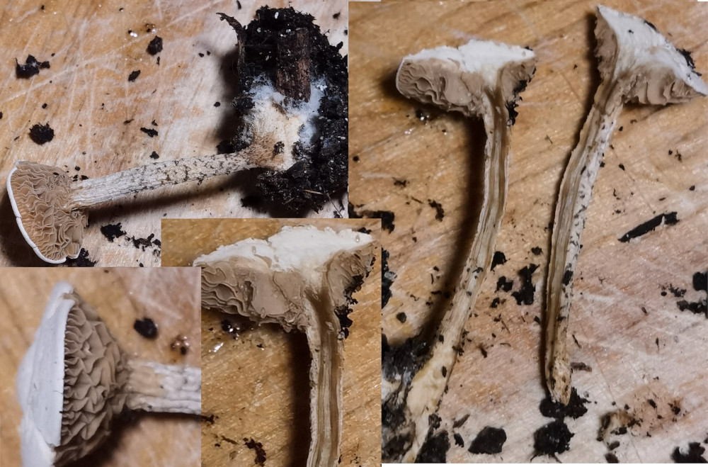 Hier noch die Fotos von Pilz 2 - Aufbau ist wie der gelbliche Pilz, von den Lamellen her - das ist der, der muffig gerochen hat im trockenen Zustand - auch hier - keine Verfärbungen. Hut ca. 0,5cm, Stil 1,2 cm. Wirkte irgendwie wie ein Hybrid aus den beiden Pilzen!?