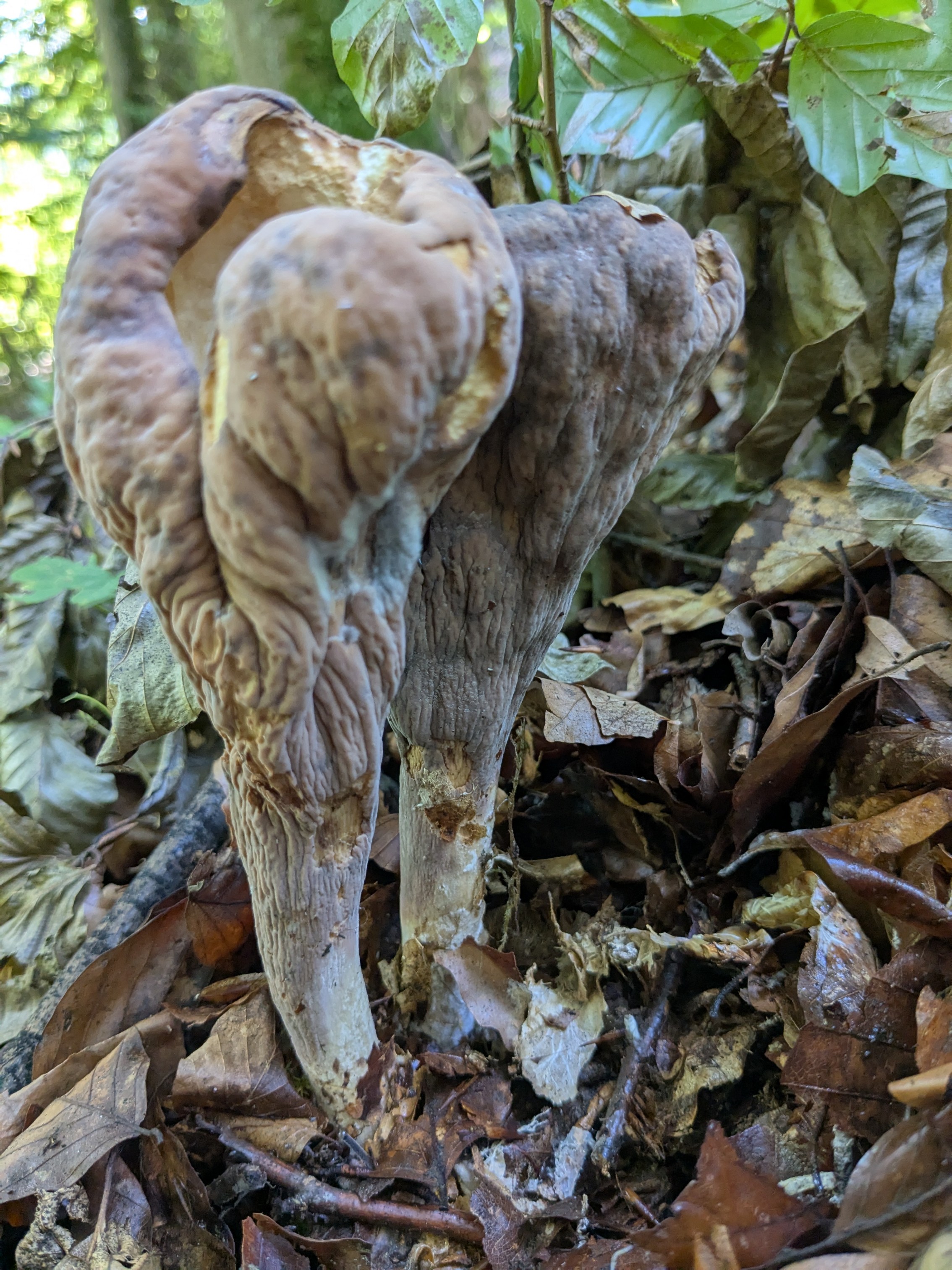 Danke auch an UmUlmHerum für die zweite Antwort zu meinem runden Baumpilz.. Zylindrische Keulenpilz Ende September, 50 km östlich von Nürnberg in der fränkischen Schweiz. Was ist das für ein Pilz im Buchenwald ? zirka 15 cm hoch und ähnlich einem Bowist. junge Exemplare haben keine Falten. Rund ein Dutzend wachsen in zwei Meter Umkreis. Prompt 2: Auf Stinkmorchel tippe ich eher nicht, die sind in so großen Stadium richtig eklig. und die jungen Exemplare sind für Hexenei nicht kugelig genug. Geruch konnte ich nicht vernehmen, da auch die alten Dinger noch geschlossen sind. bei Zusammendrücken fühlen sie sich recht hohl an. keine Angst, essen werde ich die bestimmt nicht. Zweite Antwort: Das ist eine wichtige zusätzliche Information, die die Stinkmorcheln (Phallaceae) (wie die Gemeine Stinkmorchel oder Hundsstinkmorchel) unwahrscheinlicher macht. Die von Ihnen beschriebenen Merkmale deuten stark auf einen Pilz der Gattung Clavariadelphus hin. Insbesondere der Zylindrische Keulenpilz (Clavariadelphus pistillaris) oder die Abgestutzte Riesenkeule (Clavariadelphus truncatus) passen gut zu Ihrer Beschreibung: * Form und Größe: Sie sind keulenförmig, erreichen eine ähnliche Höhe (bis ca. 15-20 cm) und wachsen oft gesellig in Laubwäldern, insbesondere in Buchenwäldern. * Oberfläche/Falten: * Junge Exemplare sind oft glatt und haben eine hellgelbe bis ockerfarbene, ungerunzelte Oberfläche. * Ältere Fruchtkörper werden oft längs gerunzelt oder gefaltet (wie auf Ihrem Foto), und die Farbe wird tiefer ocker. * Hohlheit: Ihr Hinweis, dass sie sich beim Zusammendrücken "recht hohl" anfühlen, ist ein wichtiges Indiz. Die Stiele der Clavariadelphus-Arten werden mit zunehmendem Alter oft markig bis hohl. * Geruch: Sie sind meist geruchlos oder haben einen schwachen, uncharakteristischen Geruch. * Verwechslung: Ihre generelle, keulige Form erinnert Laien gelegentlich an Boviste oder andere keulenförmige Pilze. Wahrscheinliche Bestimmung: Zylindrischer Keulenpilz (Clavariadelphus pistillaris) Der Zylindrische Keulenpilz gilt als der wahrscheinlichste Kandidat: * Er ist sehr langgestreckt und keulenförmig (daher das "zylindrisch"). * Er wächst typischerweise im Buchenwald. * Seine Oberfläche runzelt und faltet sich mit dem Alter stark. Wichtig: Der Zylindrische Keulenpilz steht in Deutschland als potenziell gefährdet auf der Roten Liste und sollte geschont werden. Da Sie die Keulenpilze nicht essen möchten, ist die genaue Unterscheidung zwischen den Clavariadelphus-Arten weniger kritisch. Die Kombination aus Buchenwald, Größe, keuliger Form, der Entwicklung von Falten und dem Hohlwerden im Alter ist sehr charakteristisch für diese Gattung.