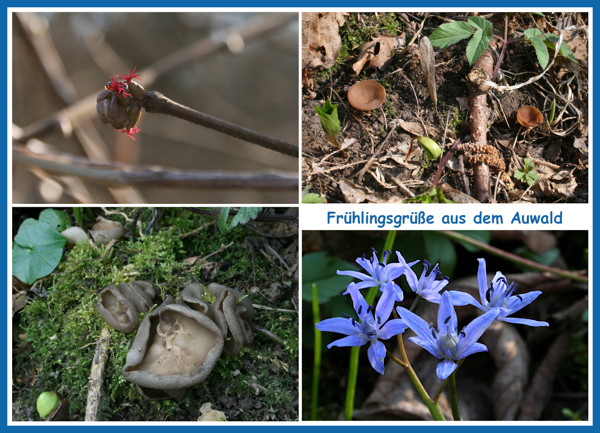 Hallo Stefan, Deine Anfrage kam – zumindest für meinen Wohnort – zu früh. Aber jetzt kommt so langsam was in die Gänge. Hier eine Zusammenstellung von gestern – die Morcheln brauchen wohl noch 2 Wochen UND ein bisschen Regen, da war nix in Sicht. Im Uhrzeigersinn: Haselblüte – Anemonenbecherling – Blaustern – Morchelbecherling (noch recht klein, habe sie stehen gelassen).
